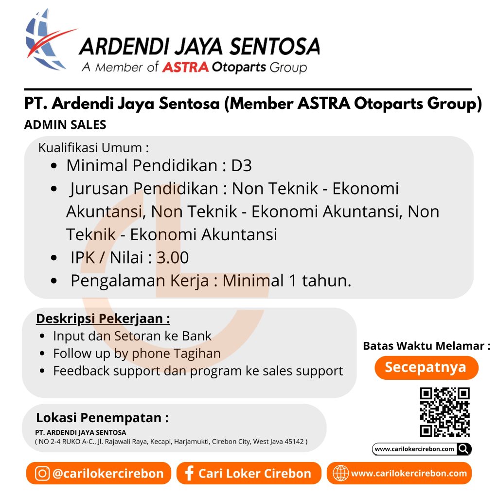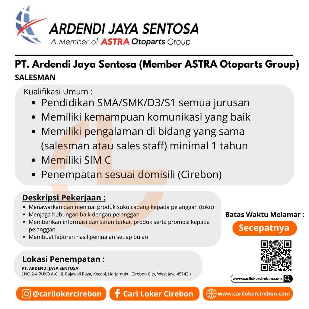 Saat ini PT. Ardendi Jaya Sentosa (Member ASTRA Otoparts Group) Cabang Cirebon sedang membutuhkan karyawan untuk posisi sebagai :